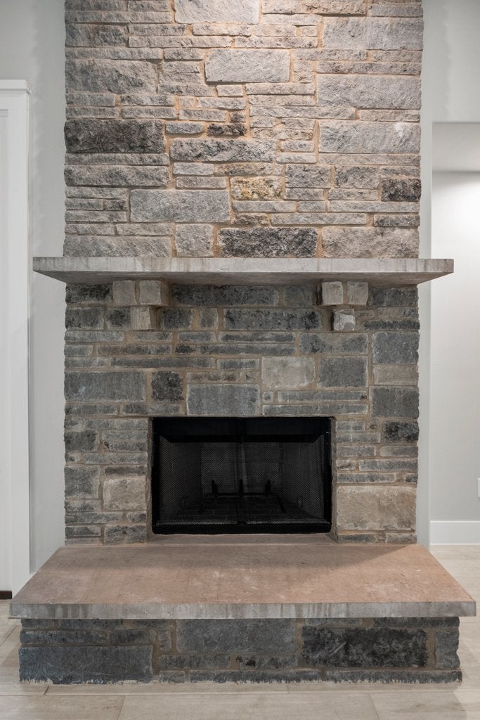 Living Room, Raised Hearth, Stone, Wood Burning