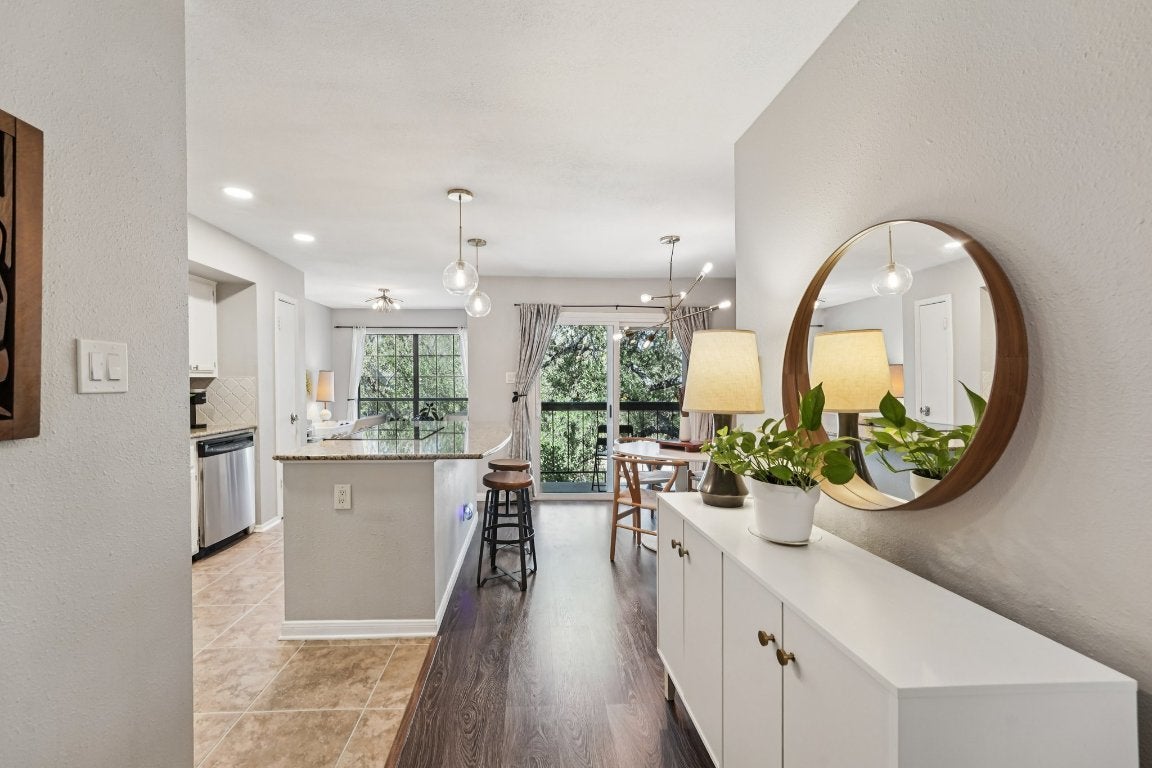 Welcome to 4159 Steck Ave, Unit 238 — a bright and inviting home featuring stylish updates, a rare completely open kitchen floor plan, and a tranquil greenspace view. The spacious living room is light-filled with beautiful lighting and thoughtful styling choices, perfect for relaxing or entertaining. A bonus room currently used as an office adds versatile space to fit your lifestyle, and a private balcony overlooks serene greenspace — ideal for enjoying the outdoors. Ideally located in Northwest Hills, this condo is within walking distance to many shops and restaurants on Mesa Drive and just minutes from The Grove Wine Bar and Kitchen, Galaxy Café, and the Broken Egg Café, as well as The Domain, H-E-B, and nearby Lifetime Fitness and Orangetheory. The kitchen flows completely open into the living area, featuring modern finishes, ample cabinetry, and a large island — a layout unique for condos in the neighborhood, perfect for entertaining. Enjoy access to the community’s sparkling pool and pickleball/tennis courts, all within a quiet and established neighborhood. One reserved parking space is included. This second-floor condo with no one above offers low-maintenance living with the Mesa Village HOA monthly fee of $312, which covers far more than the basics—water, heated water (no hot water heater needed!), trash, full exterior upkeep including roofs, chimneys, stairs, and fence repairs. Recent improvements include a pool remodel, resurfaced tennis courts, and roof replacements. Landscaping, emergency storm cleanup, property insurance, porter services, and more are also included. The entire condo has no carpet, making cleaning and maintenance a breeze — low-maintenance living at its best.